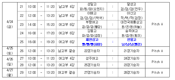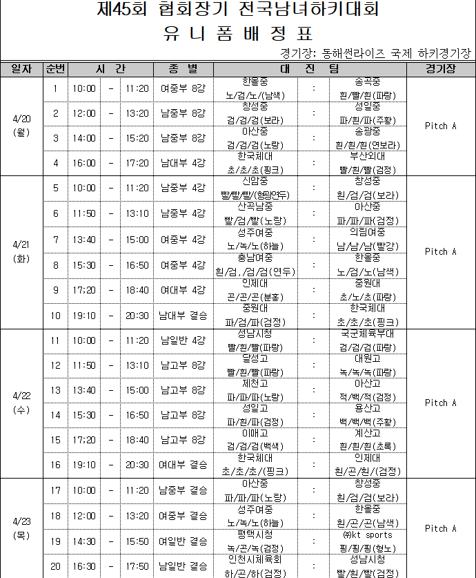 제45회 협회장기 전국남녀하키대회 유니폼 배정표 (~4.24.) 페이지 정보 작성자 하키협회 댓글 0건 조회 318회 작성일 26-04-19 본문 유니폼배정표를 다음과 같이 안내드립니다. 목록 이전글 제45회 협회장기 전국남녀하키대회 심판배정표 (04.20.) 다음글 2026 한국대학실업연맹 회장배 남여하키대회 참가팀 현황 이전글제45회 협회장기 전국남녀하키대회 심판배정표 (04.20.) 26.04.19 다음글2026 한국대학실업연맹 회장배 남여하키대회 참가팀 현황 26.04.17