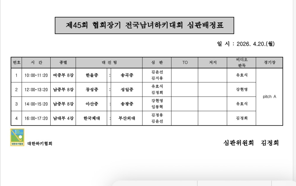 제45회 협회장기 전국남녀하키대회 심판배정표 (04.20.) 페이지 정보 작성자 하키협회 댓글 0건 조회 171회 작성일 26-04-19 본문 제45회 협회장기 전국남녀하키대회 심판배정표 (04.20.) 목록 이전글 2026 한국대학실업연맹 회장배 남여하키대회 경기 일정표 다음글 제45회 협회장기 전국남녀하키대회 유니폼 배정표 (~4.24.) 이전글2026 한국대학실업연맹 회장배 남여하키대회 경기 일정표 26.04.20 다음글제45회 협회장기 전국남녀하키대회 유니폼 배정표 (~4.24.) 26.04.19