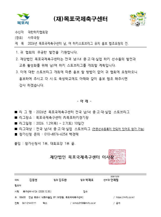 2026 목포시장기 전국 하키 스토브리그 유치 홍보안내 페이지 정보 작성자 하키협회 댓글 0건 조회 305회 작성일 25-12-30 본문 2026 목포시장기 전국 하키 스토브리그를 붙임과 같이 안내드립니다.붙임 : 홍보 공문 및 서류 각 1부. 끝 첨부파일 2026년 목포국제축구센터 전국 남녀 하키 스토브리그 유치 홍보 안내.hwp (61.0K) 전국 하키 스토브리그 참가 신청서.hwp (419.5K) 목록 다음글 2026년 동해시하키협회 지정스포츠클럽 전국 남.녀 스토브리그 유치 홍보안내 다음글2026년 동해시하키협회 지정스포츠클럽 전국 남.녀 스토브리그 유치 홍보안내 25.12.29