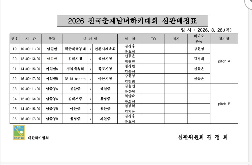 2026 전국춘계남녀하키대회 심판배정표 (03.26.) 페이지 정보 작성자 하키협회 댓글 0건 조회 47회 작성일 26-03-25 본문 2026 전국춘계남녀하키대회 심판배정표 (03.26.) 목록 다음글 제45회 KBS 협회장기 전국남녀하키대회 및 제26회 협회장배 전국생활체육하키대회 개최 알림 다음글제45회 KBS 협회장기 전국남녀하키대회 및 제26회 협회장배 전국생활체육하키대회 개최 알림 26.03.24
