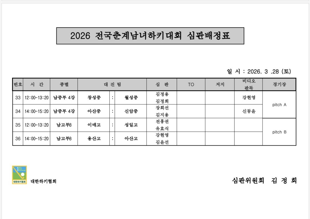 2026 전국춘계남녀하키대회 심판배정표 (03.28.) 페이지 정보 작성자 하키협회 댓글 0건 조회 148회 작성일 26-03-27 본문 2026 전국춘계남녀하키대회 심판배정표 (03.28.) 목록 이전글 2026 전국춘계남녀하키대회 심판배정표 (03.29.) 다음글 2026 전국춘계남녀하키대회 심판배정표 (03.27.) 이전글2026 전국춘계남녀하키대회 심판배정표 (03.29.) 26.03.28 다음글2026 전국춘계남녀하키대회 심판배정표 (03.27.) 26.03.26
