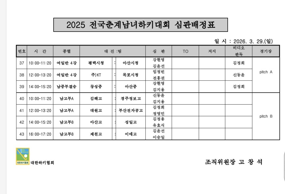 2026 전국춘계남녀하키대회 심판배정표 (03.29.) 페이지 정보 작성자 하키협회 댓글 0건 조회 143회 작성일 26-03-28 본문 2026 전국춘계남녀하키대회 심판배정표 (03.29.) 목록 이전글 2026 전국춘계남녀하키대회 후 심판배정표 (03.30.) 다음글 2026 전국춘계남녀하키대회 심판배정표 (03.28.) 이전글2026 전국춘계남녀하키대회 후 심판배정표 (03.30.) 26.03.29 다음글2026 전국춘계남녀하키대회 심판배정표 (03.28.) 26.03.27
