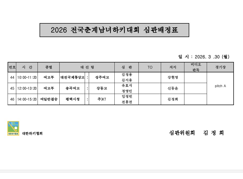 2026 전국춘계남녀하키대회 후 심판배정표 (03.30.) 페이지 정보 작성자 하키협회 댓글 0건 조회 131회 작성일 26-03-29 본문 2026 전국춘계남녀하키대회 심판배정표 (03.30.) 목록 이전글 대한하키협회 국내대회 라이브 영상 다시보기 안내 다음글 2026 전국춘계남녀하키대회 심판배정표 (03.29.) 이전글대한하키협회 국내대회 라이브 영상 다시보기 안내 26.03.30 다음글2026 전국춘계남녀하키대회 심판배정표 (03.29.) 26.03.28