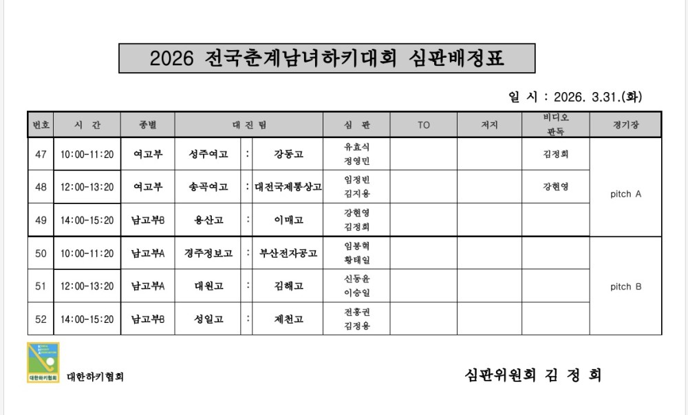 2026 전국춘계남녀하키대회 심판배정표 (03.31.) 페이지 정보 작성자 하키협회 댓글 0건 조회 67회 작성일 26-03-30 본문 2026 전국춘계남녀하키대회 심판배정표 (03.31.) 목록 다음글 대한하키협회 국내대회 라이브 영상 다시보기 안내 다음글대한하키협회 국내대회 라이브 영상 다시보기 안내 26.03.30