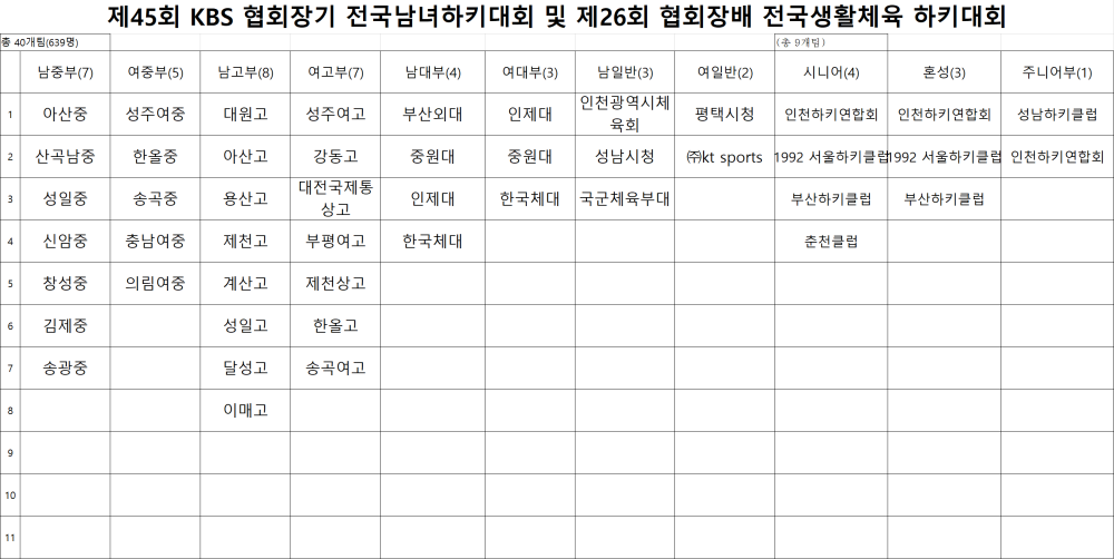 제45회 KBS 협회장기 전국남녀하키대회 및 제26회 협회장배 전국생활체육하키대회 참가팀 현황 페이지 정보 작성자 하키협회 댓글 0건 조회 163회 작성일 26-04-01 본문 제45회 KBS 협회장기 전국남녀하키대회 및 제26회 협회장배 전국생활체육하키대회 참가팀 현황을 붙임과 같이 알려드립니다. 목록 이전글 2026 전국춘계남녀하키대회 심판배정표 (04.02.) 다음글 2026 전국춘계남녀하키대회 심판배정표 (04.01.) 이전글2026 전국춘계남녀하키대회 심판배정표 (04.02.) 26.04.01 다음글2026 전국춘계남녀하키대회 심판배정표 (04.01.) 26.03.31