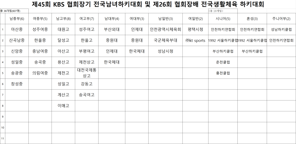 제45회 KBS 협회장기 전국남녀하키대회 및 제26회 협회장배 전국생활체육하키대회 참가팀 현황 페이지 정보 작성자 하키협회 댓글 0건 조회 287회 작성일 26-04-01 본문 제45회 KBS 협회장기 전국남녀하키대회 및 제26회 협회장배 전국생활체육하키대회 참가팀 현황을 붙임과 같이 알려드립니다. 목록 이전글 2026 전국춘계남녀하키대회 심판배정표 (04.02.) 다음글 2026 전국춘계남녀하키대회 심판배정표 (04.01.) 이전글2026 전국춘계남녀하키대회 심판배정표 (04.02.) 26.04.01 다음글2026 전국춘계남녀하키대회 심판배정표 (04.01.) 26.03.31