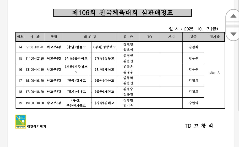 제106회 전국체육대회 심판배정표(10.17.) 페이지 정보 작성자 하키협회 댓글 0건 조회 351회 작성일 25-10-16 본문 제106회 전국체육대회 심판배정표(10.17.) 목록 이전글 제106회 전국체육대회 심판배정표(10.18.) 다음글 제106회 전국체육대회 심판배정표(10.16.) 이전글제106회 전국체육대회 심판배정표(10.18.) 25.10.17 다음글제106회 전국체육대회 심판배정표(10.16.) 25.10.15