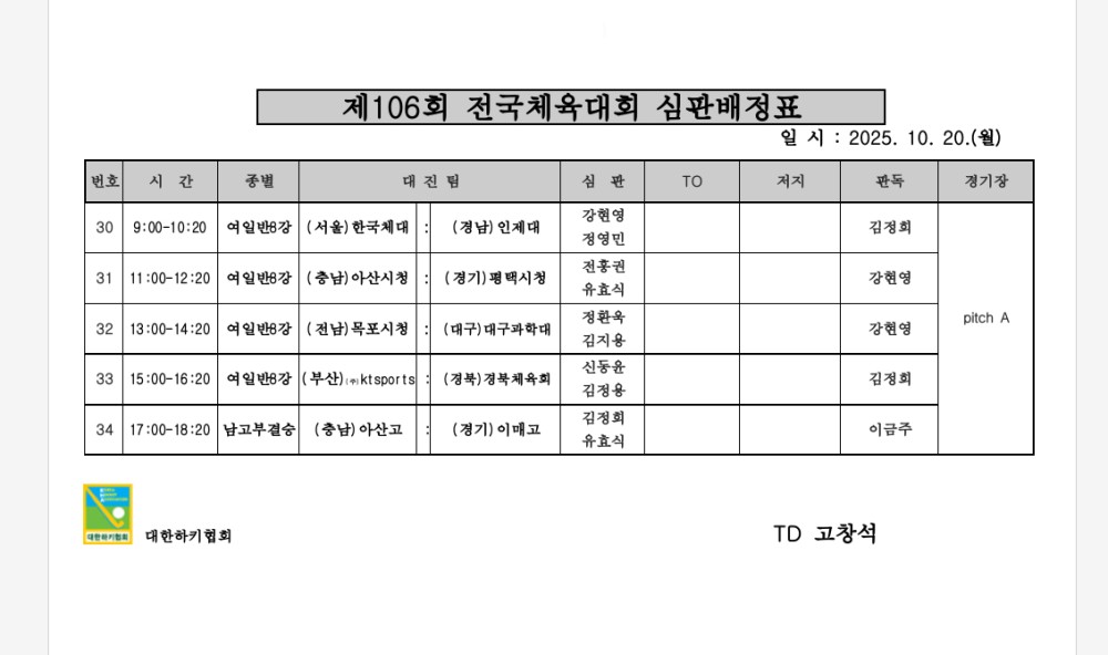 제106회 전국체육대회 심판배정표(10.20.) 페이지 정보 작성자 하키협회 댓글 0건 조회 311회 작성일 25-10-19 본문 제106회 전국체육대회 심판배정표(10.20.) 목록 이전글 제106회 전국체육대회 심판배정표(10.21.) 다음글 제106회 전국체육대회 심판배정표(10.19.) 이전글제106회 전국체육대회 심판배정표(10.21.) 25.10.20 다음글제106회 전국체육대회 심판배정표(10.19.) 25.10.18