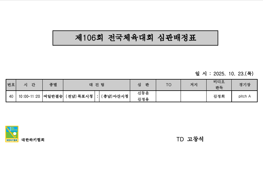 제106회 전국체육대회 심판배정표(10.23.) 페이지 정보 작성자 하키협회 댓글 0건 조회 219회 작성일 25-10-22 본문 제106회 전국체육대회 심판배정표(10.23.) 목록 이전글 제106회 전국체육대회 여자일반부 결승전 SOOP 라이브 중계 링크 다음글 2025 KHA 실내하키 U18 H1~H2 디비전 리그 개최 알림 이전글제106회 전국체육대회 여자일반부 결승전 SOOP 라이브 중계 링크 25.10.23 다음글2025 KHA 실내하키 U18 H1~H2 디비전 리그 개최 알림 25.10.22