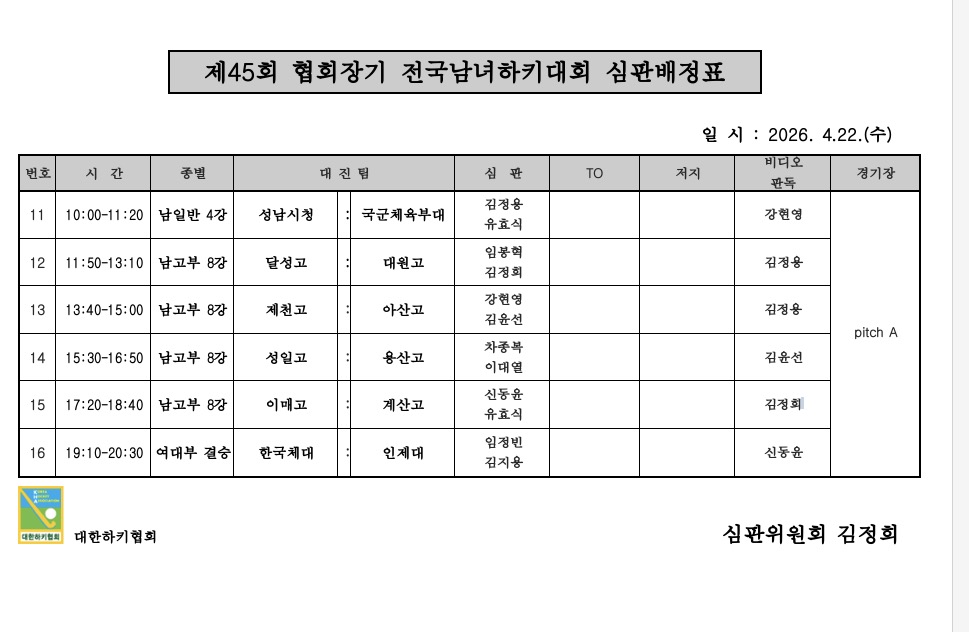 제45회 협회장기 전국남녀하키대회 심판배정표 (04.22.) 페이지 정보 작성자 하키협회 댓글 0건 조회 48회 작성일 26-04-21 본문 제45회 협회장기 전국남녀하키대회 심판배정표 (04.22.) 목록 다음글 제45회 협회장기 전국남녀하키대회 심판배정표 (04.21.) 다음글제45회 협회장기 전국남녀하키대회 심판배정표 (04.21.) 26.04.20