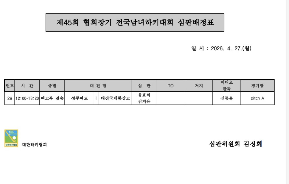 제45회 협회장기 전국남녀하키대회 심판배정표 (04.27.) 페이지 정보 작성자 하키협회 댓글 0건 조회 103회 작성일 26-04-26 본문 제45회 협회장기 전국남녀하키대회 심판배정표 (04.27.) 목록 다음글 제45회 협회장기 전국남녀하키대회 심판배정표 (04.26.) 다음글제45회 협회장기 전국남녀하키대회 심판배정표 (04.26.) 26.04.25